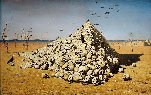 Stead reported that Vereshchagin was one of the first Europeans to venture into the heart of Central Asia, in the borderlands between Chinese empire and Russian possessions, very soon after the suppression of the Muslim revolt by the Chinese army, a struggle which lasted many years. The artist described how he entered many totally depopulated cities. One left a very vivid impression upon his mind: ‘It was a literal Golgotha, or Place of a Skull, and not of one skull only, but of many heaps of skulls. … in the neighbouring villages, streets and courts were similarly banked up with skulls and skeletons, and in the surrounding fields, so far as the eye could reach, you saw everywhere skulls, skulls, skulls! … That revolt, he calculates, cost from twenty to twenty-five million lives’.[8] It is dispiriting that the 20th century has added its own countless millions of innocents slaughtered – in the Armenian genocide, Stalin’s Gulags, Hitler’s extermination camps, the killing fields of Pol Pot’s Cambodia, Rwanda’s genocide of the Tutsi (1994) …