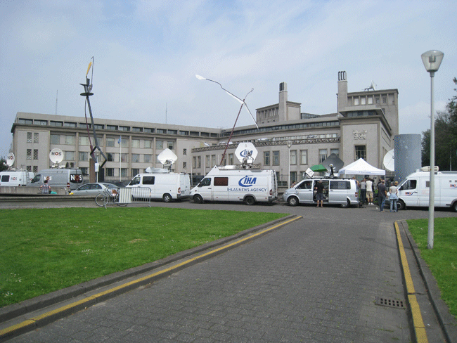 De Scheveningse gevangenis (officieel Penitentiaire Inrichting Haaglanden) rechts is regelmatig in het nieuws. Hier houdt de wereldpers de gevangenis in de gaten in afwachting van de van oorlogsmisdaden verdachte Radovan Karazic.