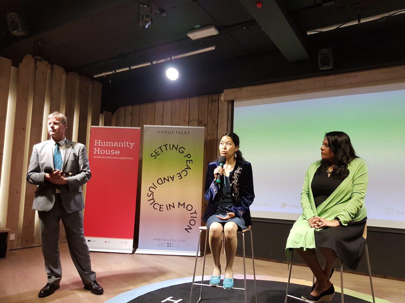 HagueTalks event in Humanity House with Alyn Ware, Deepti Choubye, and Marzhan Nurzhan about women working for disarmament and peace